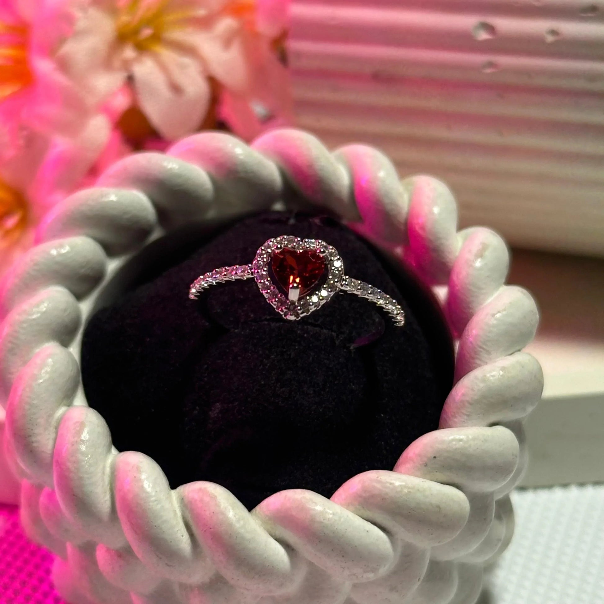 This premium maroon zircon stone, cut into a perfect heart, is gracefully set in a 925 silver-plated band and surrounded by a halo of brilliant-cut zircon stones that catch the light from every angle.